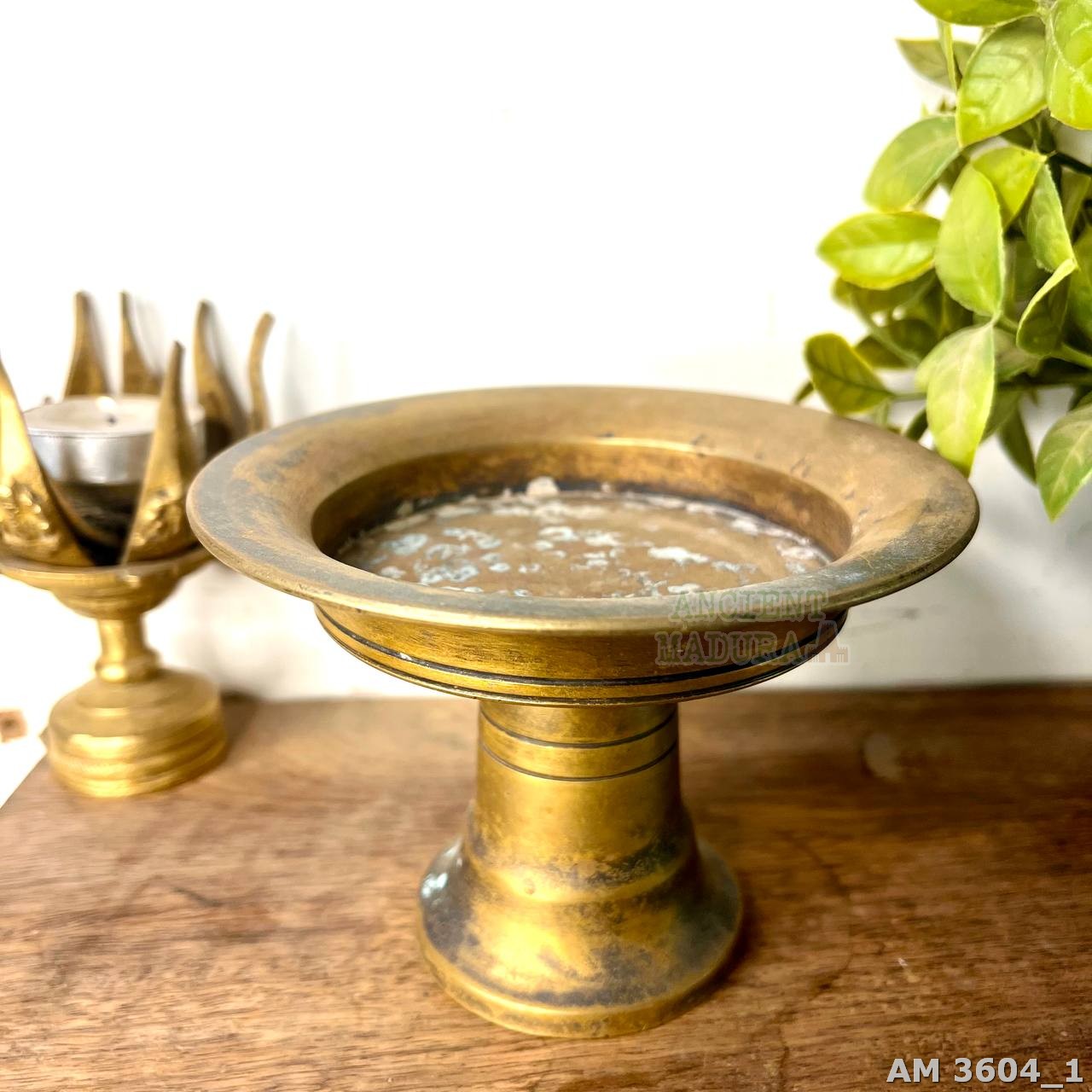 This beautiful Mini Chakra Tambalam from decades past is a rare find that is sure to add charm to your home. Exceptionally crafted in bronze, this beautiful stand features a wide, stubbly base that rises upwards to accommodate a small deep plate. Unlike most Chakra tambalams, this beautiful piece has a flared rim with a straight edge and minimalist detailing in the form of concentric circles etched on the surface. A rich patina is splotched all over, adding to its vintage charm!